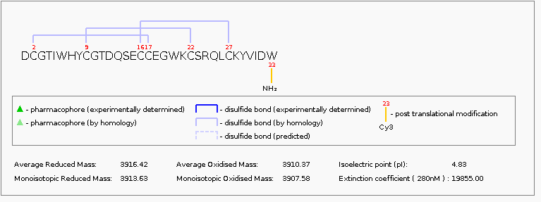 Blocks transient outward voltage-gated potassium channels in rat ventricular myocytes (thus prolonging action-potential duration) and rat Kv4.2 channels expressed in Xenopus oocytes. Assumed to be a relatively nonspecific blocker of Kv4 channels based on homology with κ-sparatoxin-Hv1b. Also reported to be a weak blocker of calcium channels in rat cerebellar granule cells. |